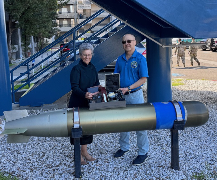 Ms. Diana Guglielmo (NIP San Diego member and USS Midway docent) received a donation of photographic interpretation equipment, light table lens, and high value target playing cards from Mr. Lance Chang (another NIP San Diego member) in support of the USS Midway CVIC Restoration Project on 13 February 2024. Both Chang and Guglielmo work at the Undersea Warfighting Development Center in San Diego, California. The photographic interpretation tools and measurement devices will be incorporated into the imagery and light table display inside of CVIC, which is anticipated to open to the public in May 2025. The CVIC spaces are currently undergoing physical restoration and hazmat removal in preparation for the exhibit development phase of the project.