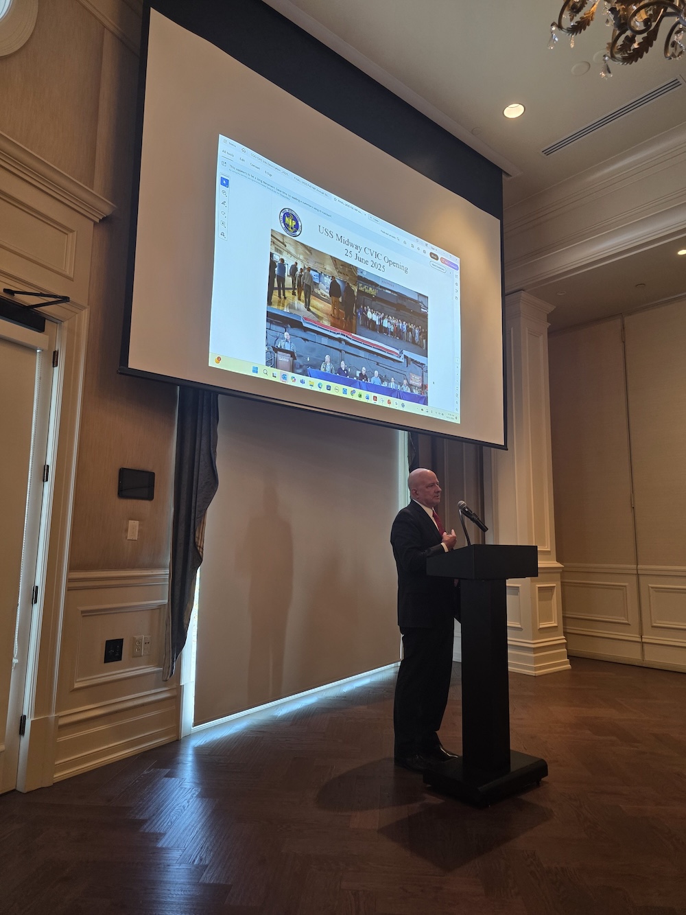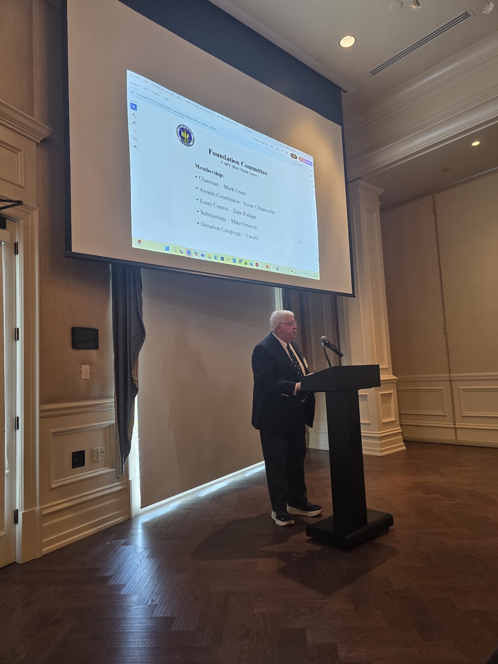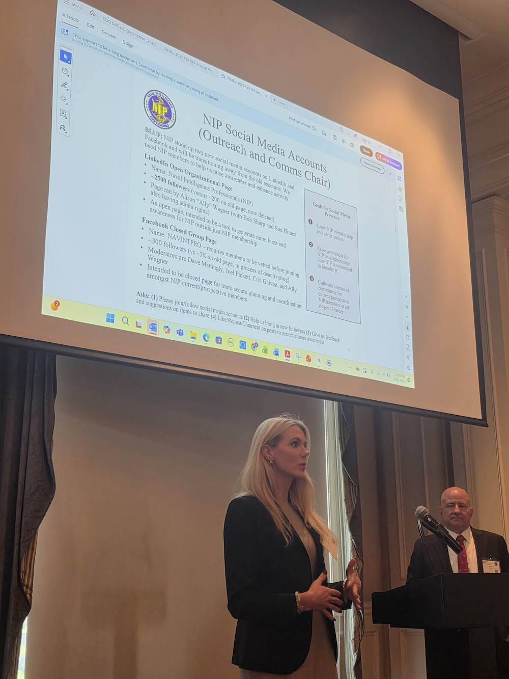 General Meeting. Chair Vice Admiral (Ret) Bob Sharp led the general meeting that took place before the luncheon, providing an overview of NIP’s initiatives and status. He spoke about our continued efforts to reach our goal of growing our membership to over 1000 members and integrate our Marine Corps intelligence professionals to make the organization truly “naval.” NIP is in great shape financially, as Captain (Ret) Jim Biggs discussed. Captain (Ret) Mark Greer provided an overview of Foundation activities, to include the recognition of the 2025 scholarship awardees and NIP award recipients. Ally Wagner talked about NIP’s social media platforms (Facebook, a closed page, and Linkedin, an open page), soliciting members to join both pages and help spread the messages by liking and sharing posts. Captain (Ret) Stephanie Leung spoke to the members about the Naval Intelligence History Project. She and Captain (Ret) Maureen Fox are collecting oral histories from those who witnessed or participated in intelligence-related operations. They are seeking both self-nominees and names of others who can provide valuable memories which illuminate our shared history.